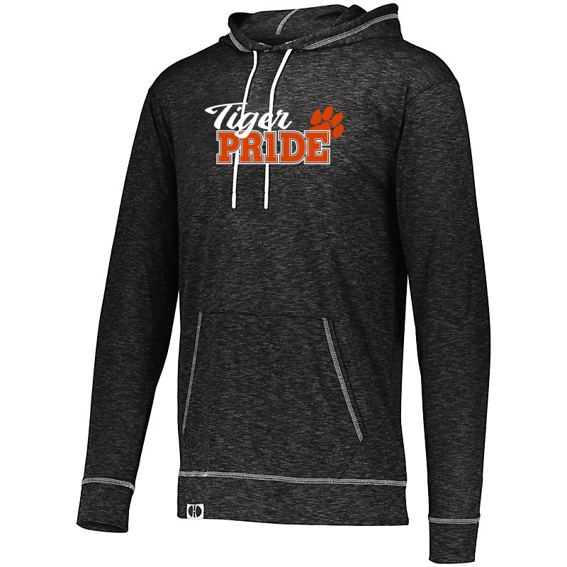 •4.1 ounce 75% polyester/25% cotton heather knit with soft cotton hand feel • Tagless label • Exterior woven logo loop label • Hood with white cotton drawcord and plastic tip on S-3XL only • Front kangaroo pocket • DTM three-needle stitching detail • Set-in sleeves