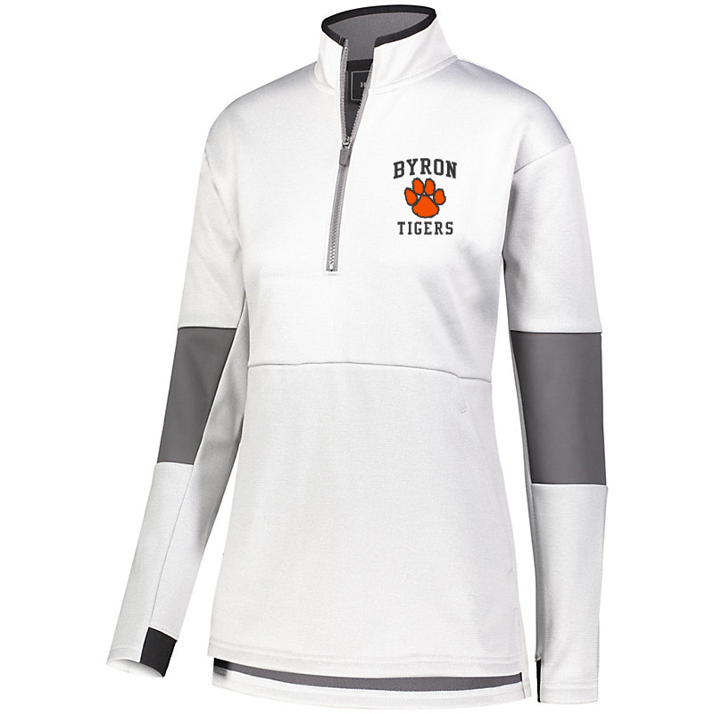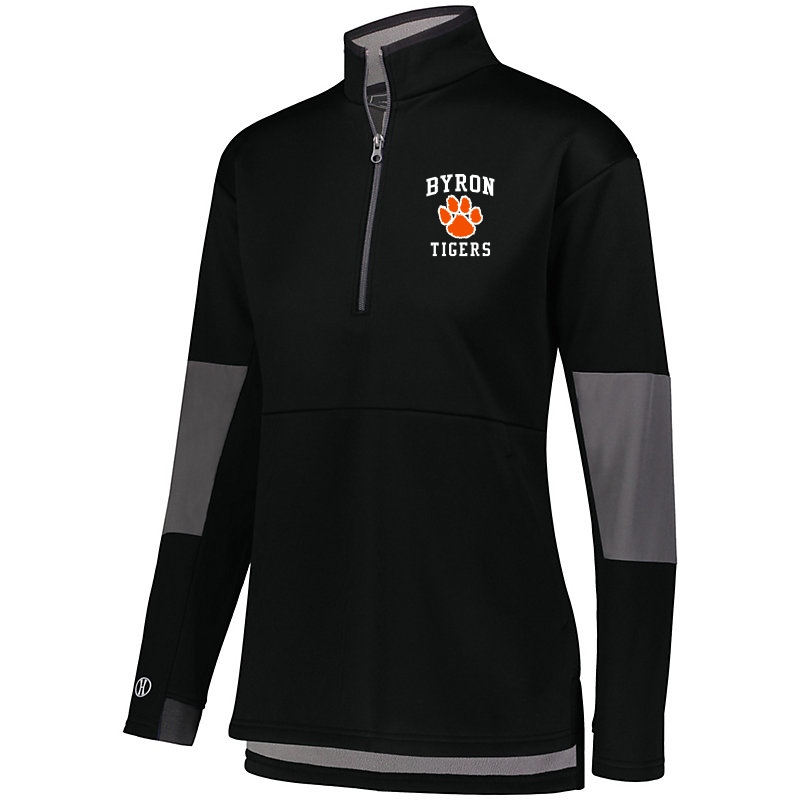•100% polyester Sof-Stretch knit with DWR finish bonded to microfleece for warmth •Storm Dfend™ Technology features durable water-resistant finish keeps you dry while knit softshell breathes to keep you comfortable •Wicks Moisture •Ladies' fit •Half-zip pullover style •Spandex bound collar •Contrast color sleeve inserts •Set-in sleeves •Front zippered pockets •Half-elastic cuffs •Dropped tail bottom with side vents
