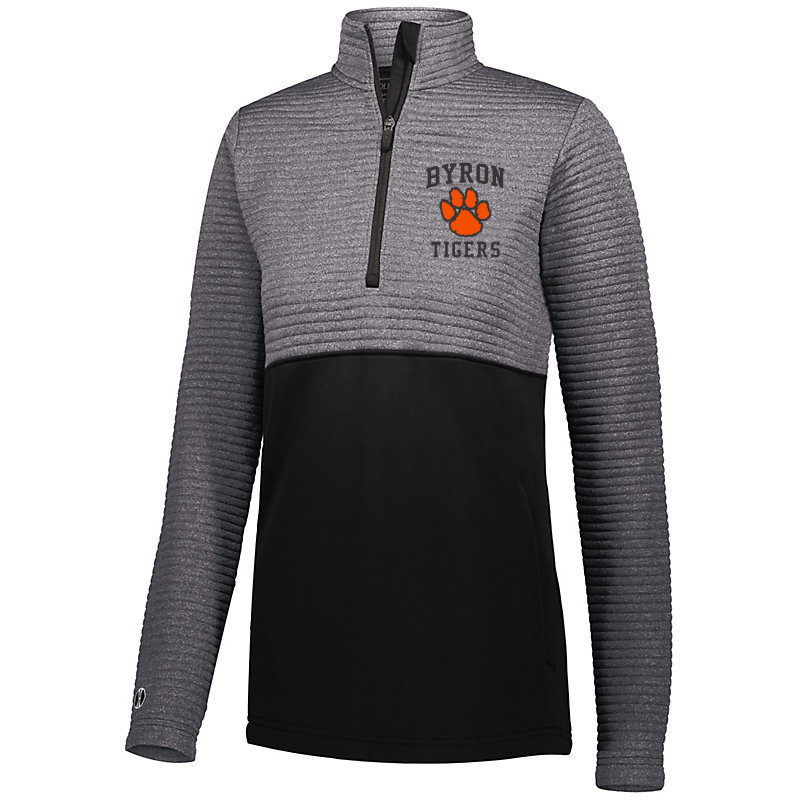 •100% polyester heathered knit with seamless quilted insulation for added warmth • Wik-Sof™ performance fleece lower body • Ladies' fit • Woven label • Half-zip pullover style with storm flap and zipper garage • Pleated back detail • Set-in sleeves • Front zippered pockets • Open bottom
