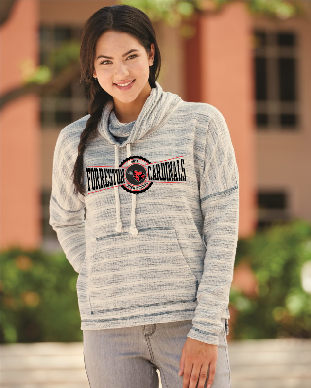 9.0 oz., 55/45 cotton/polyester french terry Yarn-dyed stripe pattern on backside of fabric Thick, off-white, rope like drawcords Stripe pattern lined cowl neck Tearaway label full chest print design