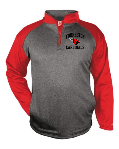 100% Heathered polyester moisture management fabric body Contrasting 1/4 zip front with self fabric collar Contrasting shoulder & sleeve panels Two front pockets Open bottom Cuffs feature smooth hem front with rib on back half Contrast stitching Embroidered Badger logo on left sleeve Embroidered school logo on left chest